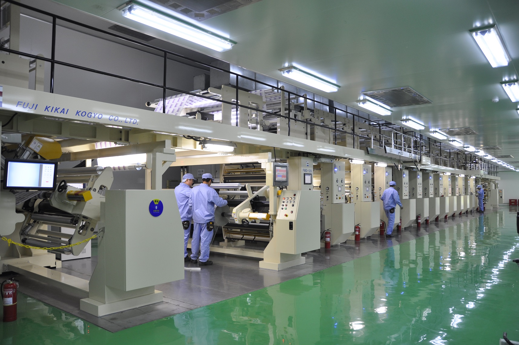 日前,公司從日本引進的12色印刷機已安裝完畢并通過驗收。該印刷機既可以生產PET、BOPP薄膜,亦可以生產紙張印刷產品。其自動對版、電子軸驅動、干燥箱噴嘴模式、新型節能熱源等,均采用當今世界最先進的技術,最高生產速度300 m/min,節能率達70%。
