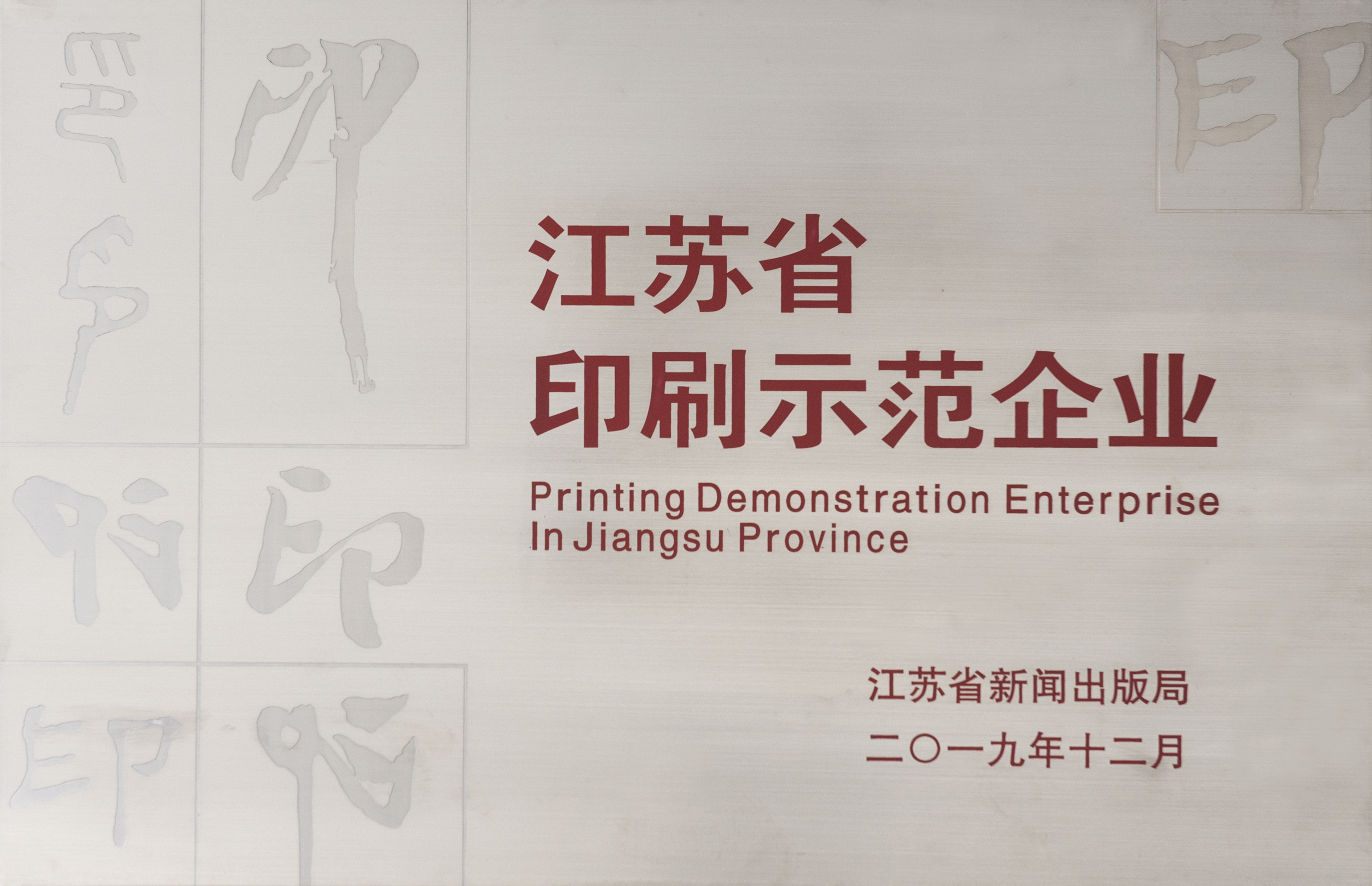 近日,從江蘇省新聞出版局獲悉,經過企業組織申報、審核勘驗、公示認定、集中授牌四個環節,我公司被江蘇省新聞出版局授予2019年度“江蘇省印刷示范企業”榮譽稱號。